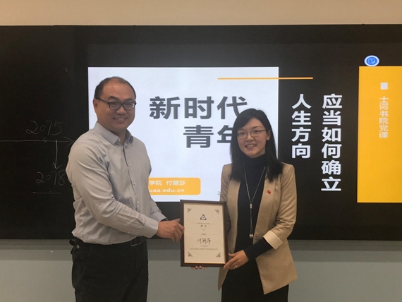 课后,由书院党支部书记孙泽斌为付丽莎老师颁发聘书,聘请付老师为士谔书院思政导师。