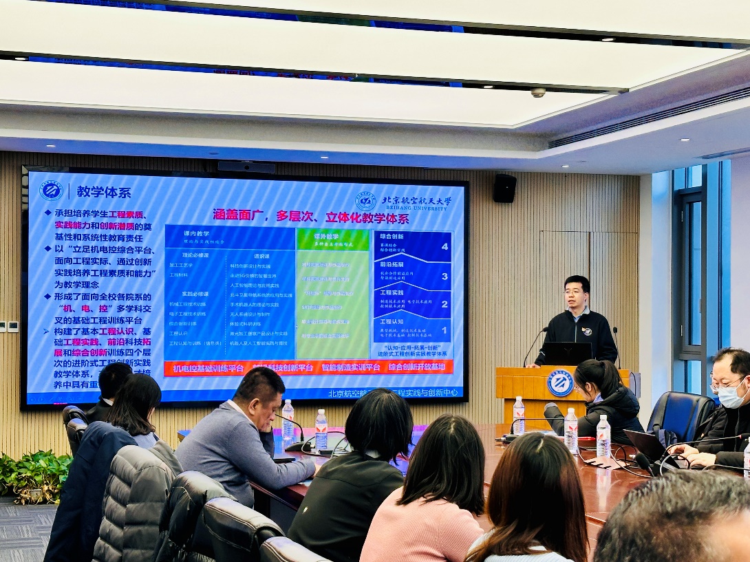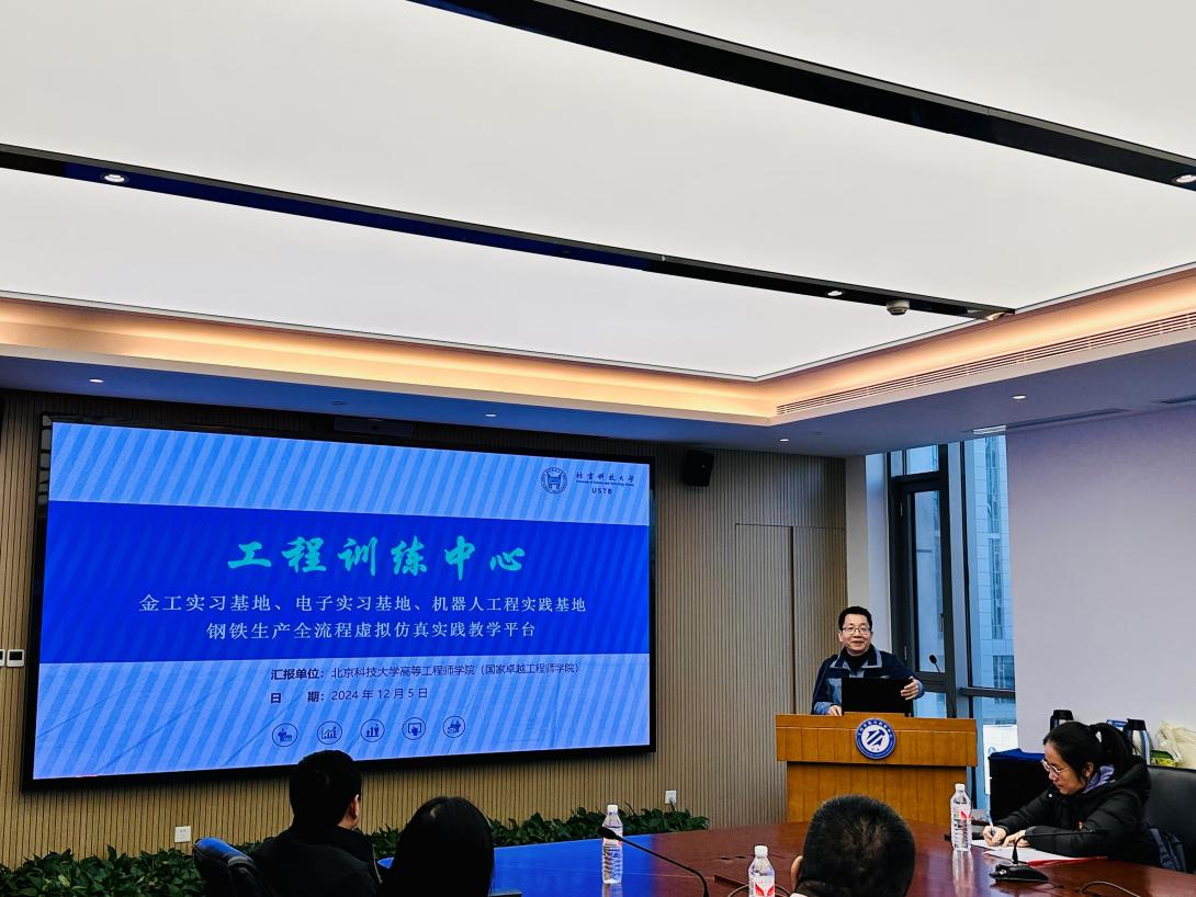 工程实践与创新中心概况、组织架构、党的建设、教学体系、开设课程、科创育人等方面的基本情况。吕庆功介绍了北科工程训练中心概况、金工实习基地、电子实习基地、机器人工程实践基地、虚拟仿真平台的基本情况以及雄安新校区工程实践创新基地的规划。