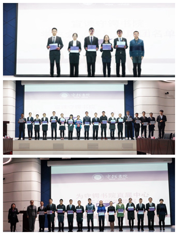 仪式聘任辅导员王子琦老师为学生会(筹)指导教师。书院专职辅导员韩庚老师宣读了筹建期主席团名单,并为他们颁发聘书。王子琦老师宣读了团委直属部门及学生会(筹)各部部长副部长名单,并为他们颁发了聘书。蒋茁老师宣读了守锷书院直属中心干部名单,陈瑜老师和纪奕欣老师为他们颁发了聘书。