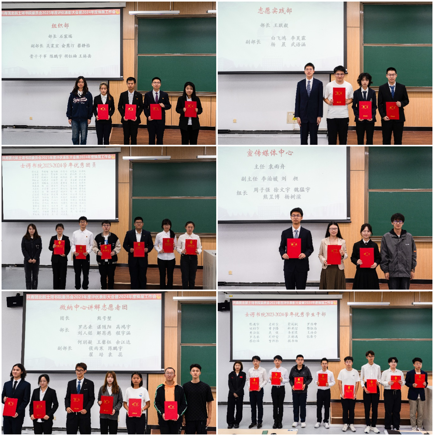 会议上宣读2023-2024学年度校级、院级共青团评优结果与团委各部门新任干部名单,并由2024级半脱产辅导员为获奖代表与干部代表分别颁发证书与聘书。各部门新一届主要负责人依次发言总结过去一年工作成果,汇报新学年工作思路,展望未来图景。