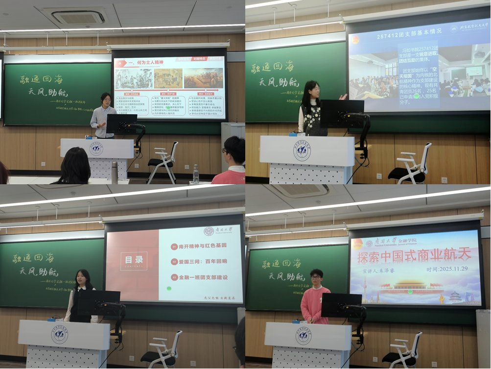 在主题分享环节,南开大学金融一班班长朱泽睿以《金融+航天:探索中国式商业航天》为题作交流汇报,从金融视角介绍商业航天发展面临的机遇与挑战,为同学们提供了新的观察角度,也使活动在专业交流层面实现进一步拓展。
