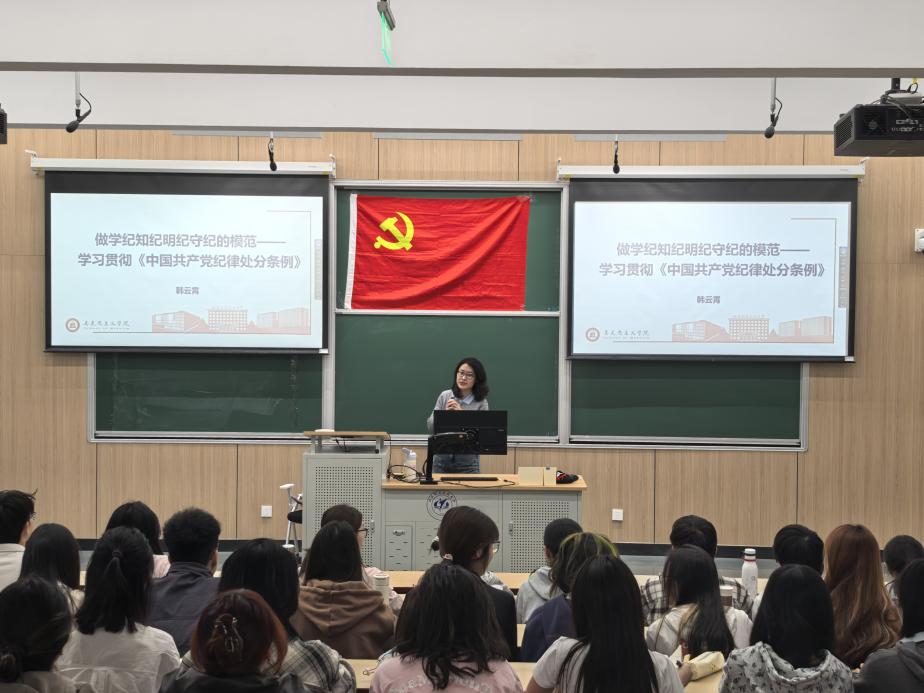 本次党课在庄严的《国际歌》声中正式拉开帷幕。马克思主义学院韩云霄以《做学纪知纪明纪守纪的模范——学习贯彻〈中国共产党纪律处分条例〉》为题,为全体学员带来一堂主题鲜明、内容详实的专题党课。课程紧扣《中国共产党纪律处分条例》(以下简称《条例》),从发展历程、修订缘由、核心内容以及学习贯彻落实等四个维度进行系统阐释与深入解读,引导全体学员进一步强化纪律观念、明确行为准则,切实筑牢纪律防线。