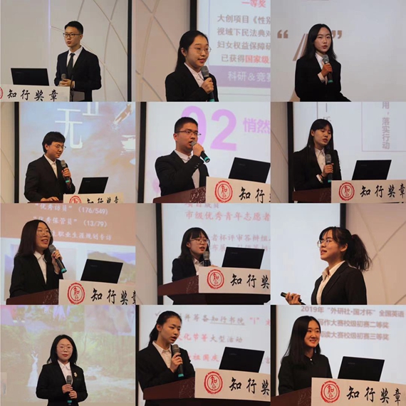 12位“知行奖章”候选人依次分享了自己在学业发展、科研创新、社会服务、文艺体育等方面的成长经历,展示了知行学子的风采,也为20级的学弟学妹们做出良好的榜样。