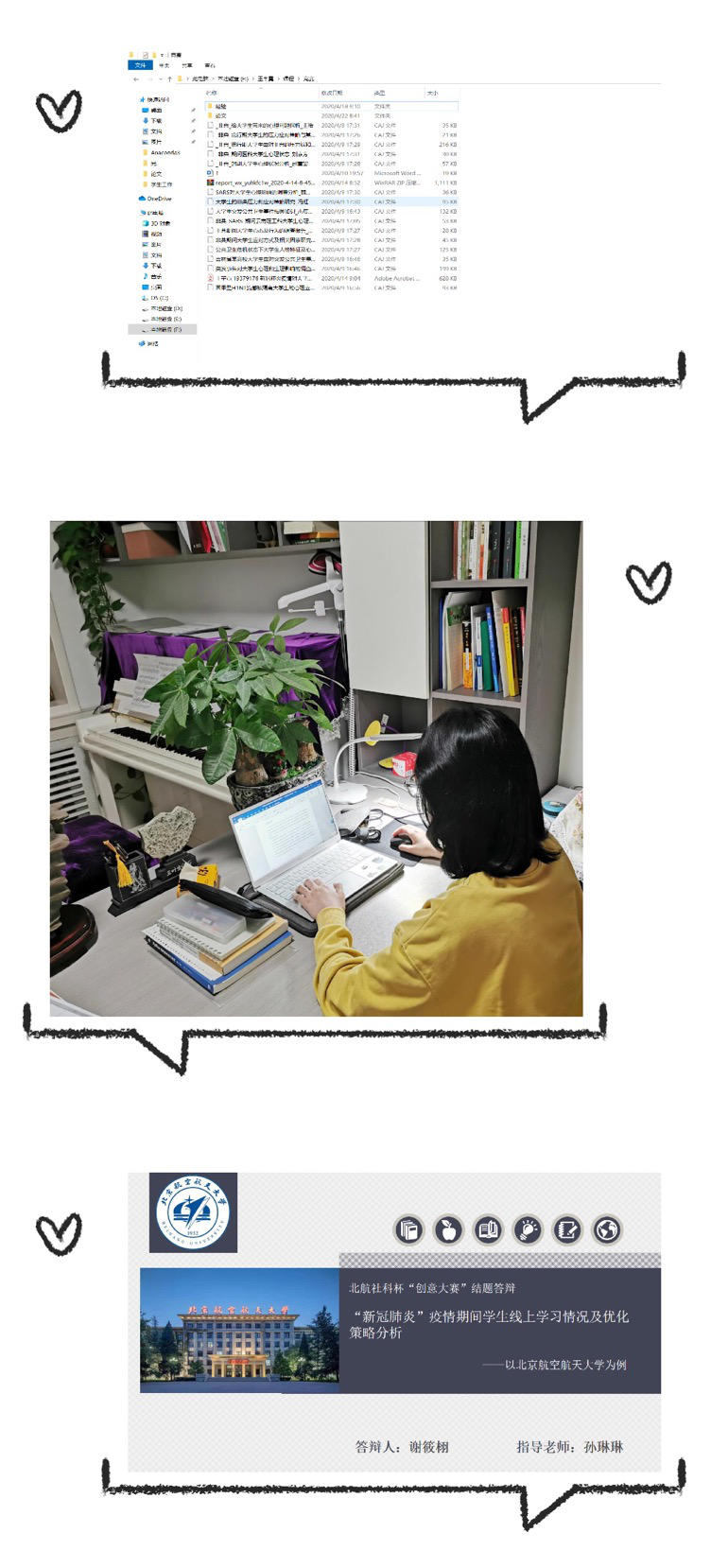 疫情期间,我们学习生活的有序进行,离不开学校、老师以及每一位学生的共同努力,这也是我论文选题的灵感来源。撰写论文的过程也是一波三折,我的论文总共换了三次选题,指导老师始终耐心为我讲解、拓展思路、推敲写作的角度与深度;调查问卷的数据收集离不开同学们的热情帮助;导员和学长学姐们通过宣讲等多种形式,让我们对比赛的流程和论文撰写以及答辩的技巧有了更好的掌握;评委老师也从不同角度为我们提出改进的建议;同学们精彩的答辩更是一次精彩的思想碰撞。这一次的社科杯竞赛,全程都是以线上的形式进行,整个过程不仅有学术水平的提升、竞赛经验的积累,也收获了满满的感动。