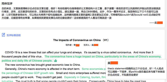在学生完成整个任务之后,师生合作评价既是对产出任务的反馈也是另一种学习,包括学生互评和教师评价。学生互评在IWrite平台上进行,易于操作,学生按照checklist进行分项评价和整体评价。之后,教师也同样会对每份作业进行评价。最后,在吸纳同伴和老师的反馈基础上,学生完成第二稿作文并提交。