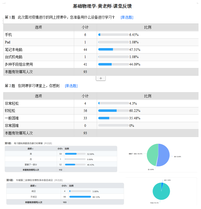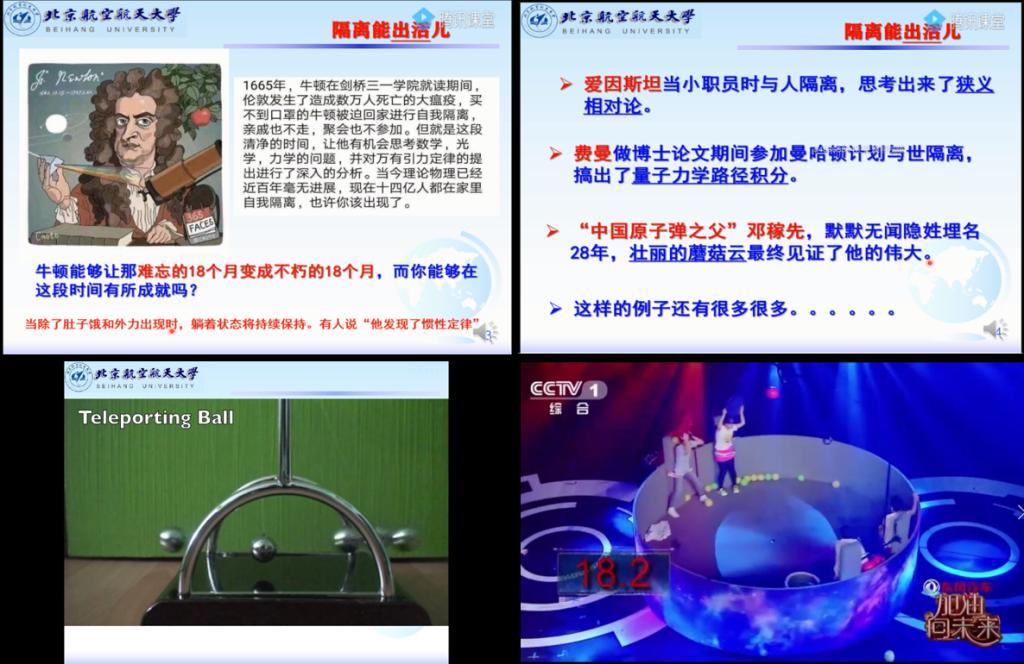 线上教学,交互方式不再是面对面的人际交互,而是人机交互。“学生长时间观看屏幕,会容易失去兴趣”、“如何破除学生与屏幕“两张皮”的状态”、“怎样能够让上课像观看电影、电视那样吸引人”。为了解决上述问题,课程组教师经多方讨论一致认为,必须对现有教学内容重新设计,增强课程的挑战性、趣味性,才能调动学生的学习兴趣,增强持续性。为此加入丰富生动、有趣的案例,如为了鼓励同学们在疫情期间克服困难、积极向学,列举了著名物理学家牛顿鼠疫期间居家隔离发现“万有引力”的故事;为了更好地理解物理学知识,提出“往杯子里倒水为什么七分满、沙丘形状的成因、鸟儿搭窝”等问题,引导同学们注重观察身边的物理学,积极思考,学以致用;关于物理学的学习与思考不仅局限于身边,还放眼到更为广阔的空间,以内容设计为出发点,结合重难点讲解,希望培养学生的主动思考、自主学习的能力。