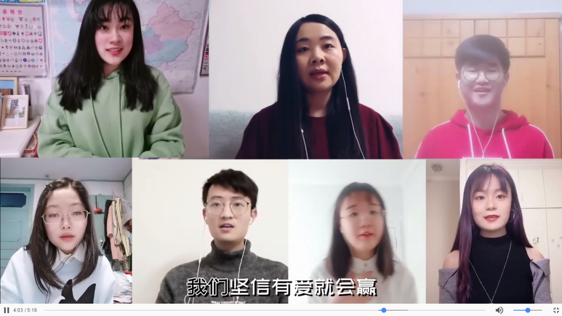 青春战疫,坚信有爱就会赢。为了向前线战士致敬,提高同学们的信心,致真书院面向全体学生,发出“云”合唱的号召,选择了由中国文艺工作者们共同创作的一首以抗击疫情为主题的歌曲《坚信爱会赢》,由工作人员对辅导员和同学们的歌唱成果完成MV剪辑。