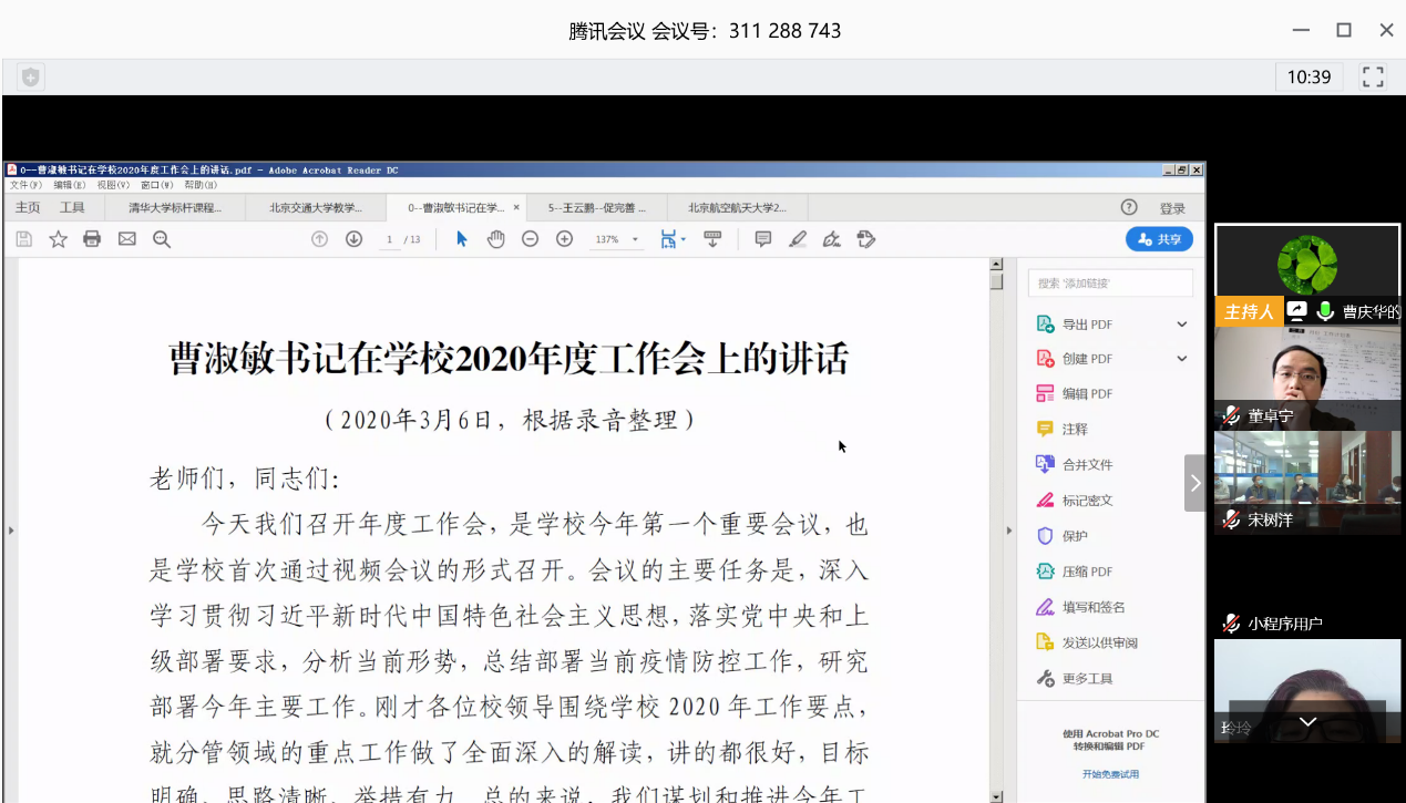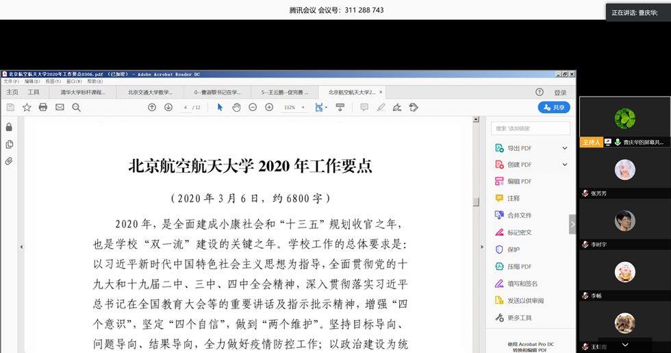 以视频会议形式,召开全体教职工会议,传达和学习学校工作会议精神和2020年度工作要点,对必威工作作出部署,提出要求。必威常务副院长曹庆华、常务副书记董卓宁等全体班子成员,必威全体工作人员130余人参加会议。会议由曹庆华主持。