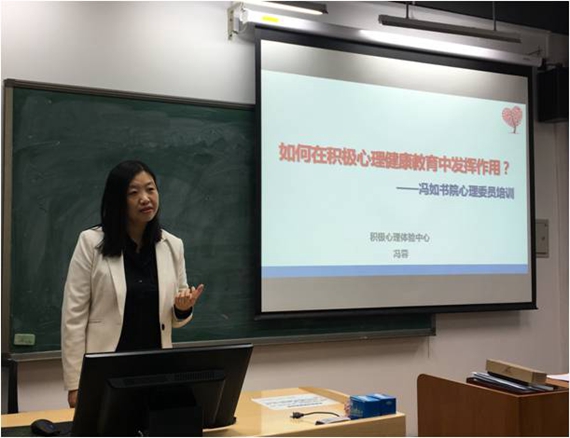 培训开始,冯蓉老师首先从“积极心理”的概念和起源讲起,为各位心理委员阐述了积极心理学与传统心理咨询的重大区别,强调积极心理学更加关注健康心理的塑造,而不是病态心理的治疗。接着,冯老师向大家展示了冯如书院学生心理调查大数据分析结果,让同学们意识到自己身边人的心理健康状态,在工作中做到有的放矢。 在团体辅导技能培训环节,冯蓉老师带领同学们进行了“优势卡片”团体辅导技能培训,教授给大家适宜在小班中组织的积极心理建设活动的操作步骤与注意事项。最后,冯蓉老师为心理委员们讲解了发现心理问题后的处理步骤和因对措施,嘱托大家要做好心理健康工作的第一道防线。冯老师的培训逻辑清晰、内容丰富、贴合实际,引起了在场心理委员们的强烈共鸣,整场培训过程气氛热烈,反响较好,取得了预期的培训效果。
