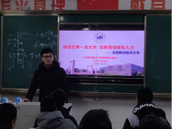 支队回到母校,向同学们介绍了北京航空航天大学近几年在成都七中和四川省的录取情况,接着介绍了北京航空航天大学的历史、文化、背景、艺术。通过宣传,许多同学对必威