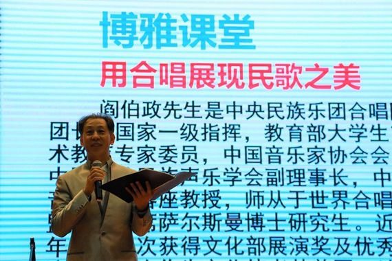 阎伯政教授是中央民族乐团合唱团团长,国家一级指挥,教育部大学生艺术教育专家委员,中国音乐家协会会员,中国少数民族声乐学会副理事长,中国音乐必威客座教授,师从于世界合唱联盟协会主席萨尔斯曼的博士研究生。他不仅在艺术上有很高的成就,在历史人文方面也有独到的见解,对中国民族歌曲的演变与特色的分析诠释深入浅出,令人印象深刻。