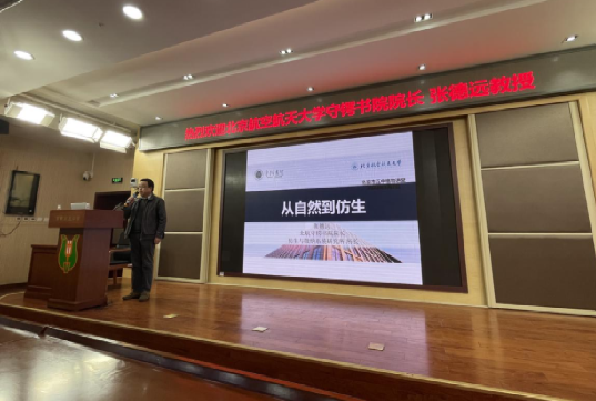 随后,张德远为北京五中学生带来题为“从自然到仿生”的精彩报告,从自然之美的和谐、仿生灵感的产生、人与自然的协同三部分为同学们揭开了仿生学的奥秘。仿生学通过模拟的方法把对生命的研究和实践结合起来,向各种自然科学和技术科学输送宝贵的资料和丰富的营养,加速科学的发展。同学们学习到了人类要认识自然微观,改造自然仿生,融入自然智能,更意识到了只有复杂地、综合地认识各个自然学科,并学会运用交叉学科知识,才能更有效地解决现代科学问题。