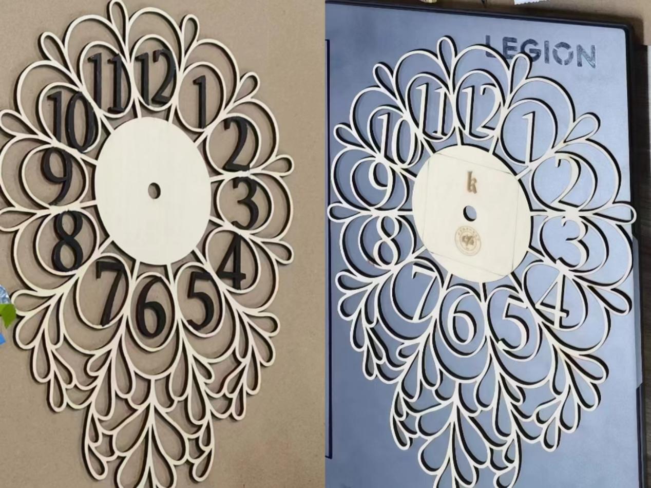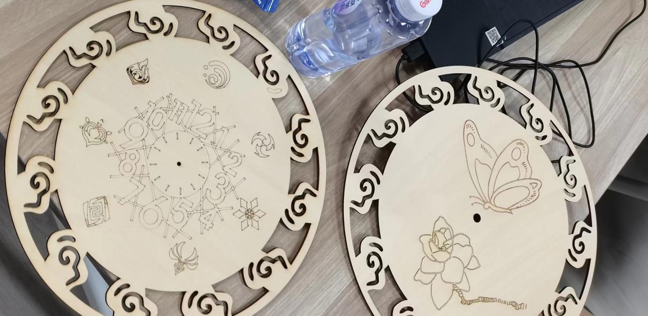 在激光切割机的操作下,钟表图纸从电脑上的虚拟形态逐渐变成了实体的钟表表盘。