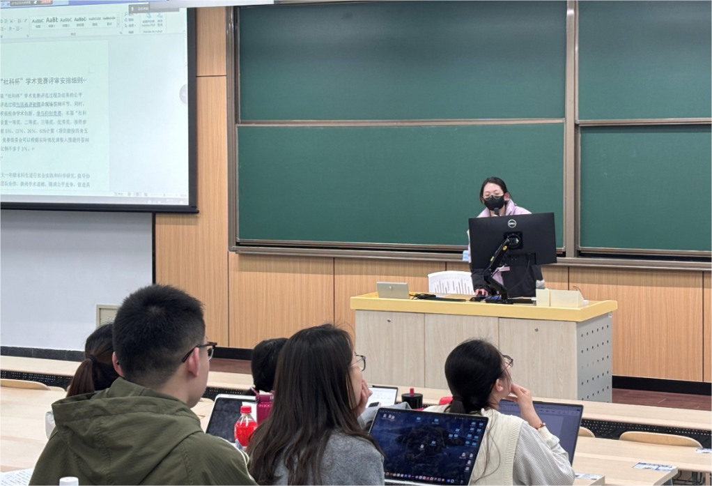 王语盈、王泺源两位学姐结合在“社科杯”“冯如杯”的参赛经历,强调框架凝练、答辩精炼与团队协作的重要性,鼓励同学们以兴趣为锚,大胆创新,并以知识产权保护、乡村性教育项目为例,阐释如何通过“经典理论—现实矛盾—解决方案”逻辑链提升学术说服力。