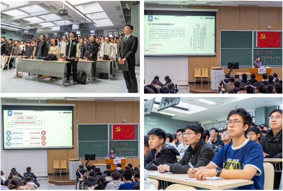 本次党课在《国际歌》的旋律中拉开帷幕。黄瑶老师以辨析“持久战”与《论持久战》的概念为切入点,通过互动提问引发学员思考, 明确二者的核心区别。随后,她对比“持久战”与“决战”的战术差异,引出“持久战何以持久”这一核心问题,围绕“何以持久”“持久是多久”“如何持久”三个方面展开讲解。黄瑶老师对比分析国共两党对于“持久战”的不同理解与实践路径。国民党采取消极抗战策略,导致“花园口决堤”“文夕大火”等惨案,收效甚微;而共产党坚持全民族抗战路线,致力抗战自救,开展敌后抗战,发动人民战争,践行“兵民是胜利之本”的理念。最后,黄瑶老师强调,人民战争的思想与党的群众路线在革命战争中的运用与发展,为最后获得全面抗战胜利奠定了重要基础。