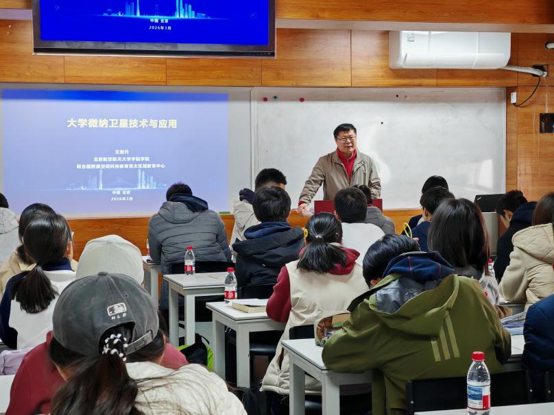 随后,宇航学院王新升教授以《大学微纳卫星技术与应用》为主题开展专题讲座,围绕微纳卫星技术现状、发展动因、团队建设及应用前景进行深入讲解。讲座结合国内外典型案例,分析了微纳卫星的实践应用,并对大学微纳卫星有效载荷、总体设计及应用等核心环节进行了重点讲解,让在场同学真切感受到微纳卫星“以小见大”的科技魅力。