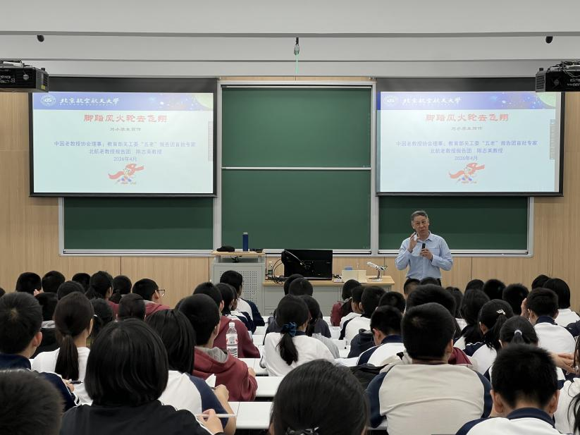 参观结束后,北航老教授报告团陈志英教授为师生一行带来《脚踏风火轮去飞翔》主题科普讲座。陈志英以哪吒“风火轮”为引,生动阐释了飞行器升力与推力等基本原理,并介绍了飞机、火箭等不同飞行器的运行特点,并围绕中国空间站建设、载人航天工程、嫦娥探月、天问一号火星探测等重大科技成就,进一步讲述了科技创新和科学探索的重要意义,勉励学生们厚植家国情怀,涵养科学精神,树立探索未知、勇于创新的志向。