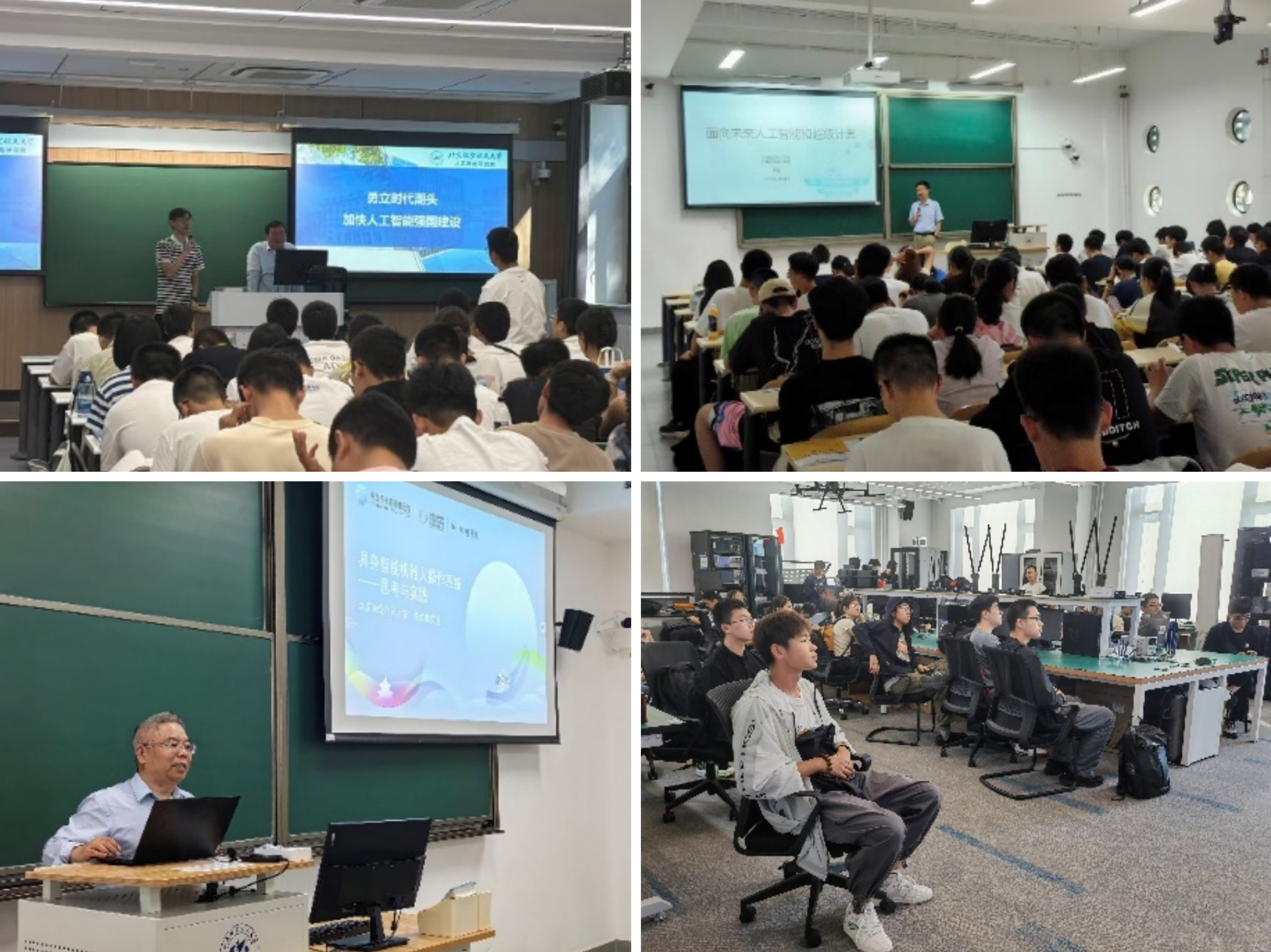 计算与智能科学类各专业必威带领同学们深入必威重点实验室,近距离接触行业前沿技术与科研成果。计算机必威李波老师为同学们作《面向未来人工智能和超级计算》主题讲座,深入探讨了AI的局限性,同时强调了计算机学科与其他领域的跨学科合作潜力,并指出计算机学科与多学科交叉的重要性,展示了其在推动科技进步中的关键作用。软件必威副院长谭火彬老师介绍必威概况与培养方案,牛建伟、盛律、于茜、张晶四位老师分别分享了具身智能与机器人融合、大小脑协同模型、大模型赋能矢量图与草图理解、多模态大模型驱动Web UI Agent等前沿技术。网络空间安全必威高年级学生带领一年级新生参观各类实验室,沉浸式体验网络空间对抗与舆情管控的实战场景,近距离感受AI社交机器人账号的存在与舆情引导原理。人工智能必威(人工智能研究院)吴文峻老师以图灵测试等案例阐释了AI的概念与能力并回顾发展历程,强调了需求、算法、算力协同的重要性,重点介绍必威五大方向以及取得的重大成果,并向同学们介绍了必威以基础理论为核心、结合多领域技术与应用的育人体系。