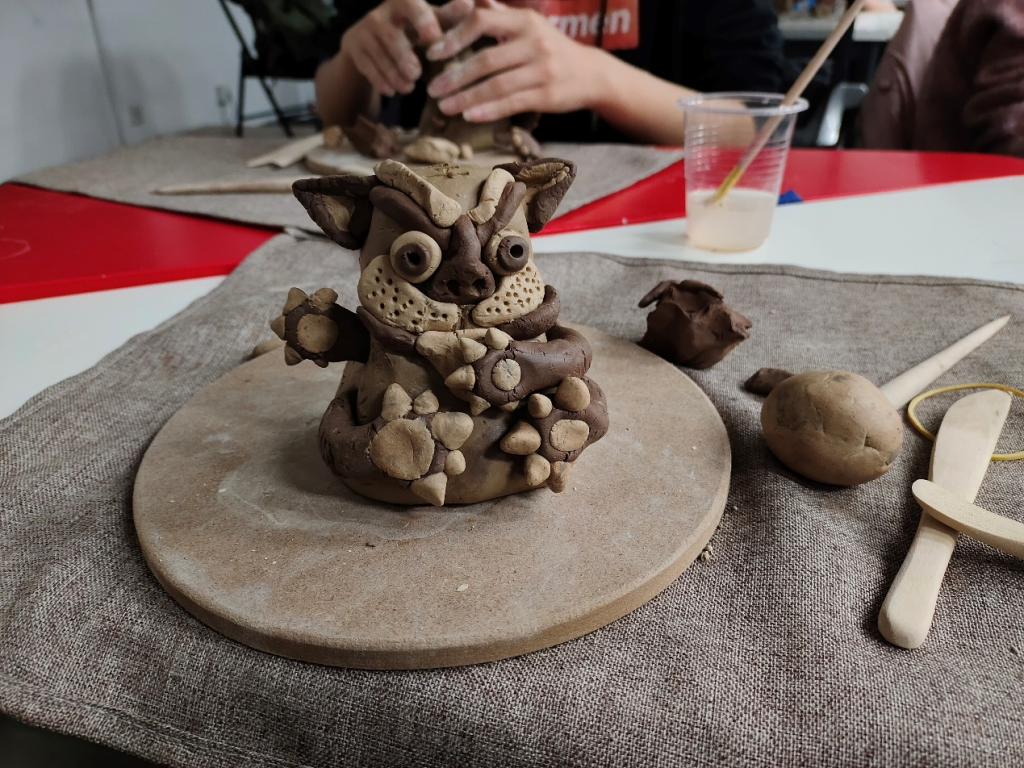张大为老师为大家细心讲解了我国陶瓷史和五大名窑的特点,带领同学们了解了我国各具特色的陶器。他还讲解了陶器制作的过程,普及制瓷工艺、烧制工艺、拉胚、捏塑等基本知识,并亲手带领学生们制作陶艺作品。讲解过后,学生们现场进行拉胚、捏塑等操作,并充分发挥自己的想象,加入自己想要的元素做出了各具特色的可爱作品。