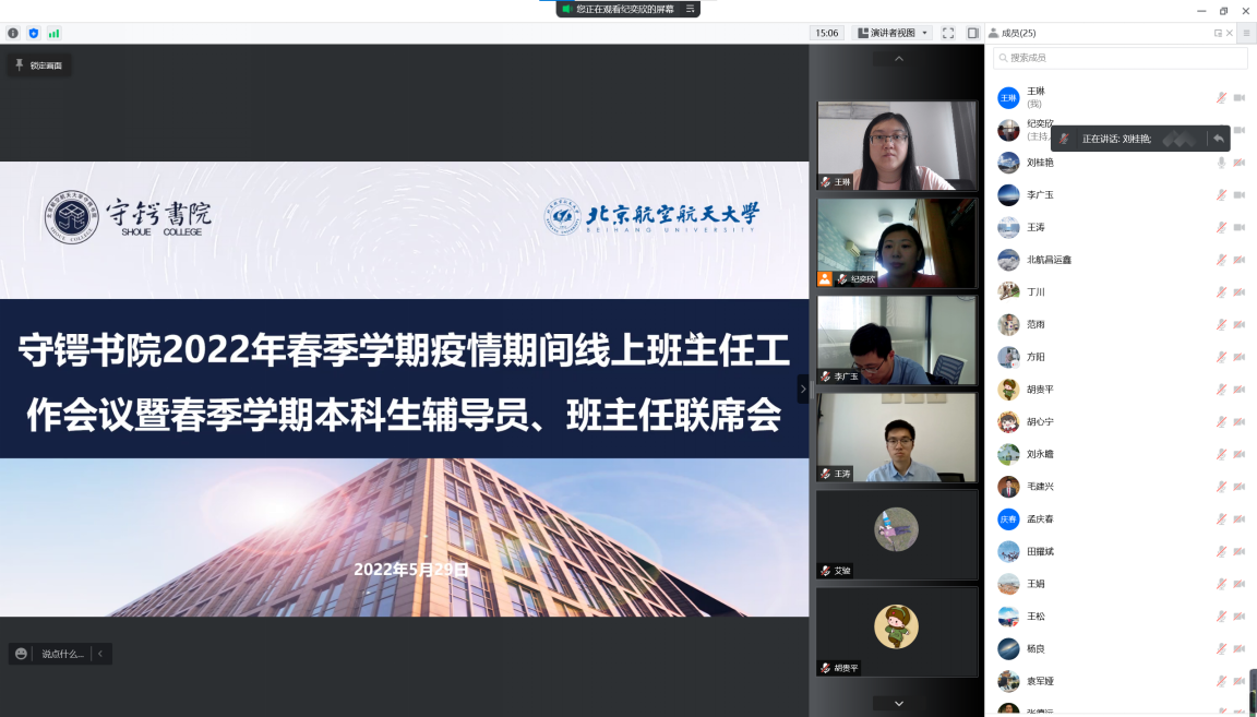 (通讯员 王涛)为进一步做好书院疫情防控工作,与书院全体班主任统一思想,顺利完成学生返乡服务、学业提升等相关工作,5月29日中午12点30分,北京航空航天大学守锷书院在腾讯会议平台召开疫情期间线上班主任工作会议暨春季学期本科生辅导员、班主任联席会。院长张德远、学业总导师孟庆春、执行团队成员和书院2021级15位班主任参加本次会议。本次会议由学业助理纪奕欣主持。