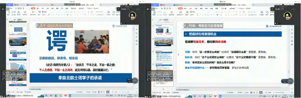 为充分发挥班主任对学生学业帮扶和学涯指导方面的作用,引导学生积极备考,诚信应考,士谔书院组织班主任集体备课并全覆盖召开了主题班会。班会中各班主任反馈了课程组座谈会中反映的相关情况,给出了线上学习及备考建议,叮嘱学生在线上学习阶段养成良好生活学习习惯。小班会解决了学生关于近期线上学习的困惑和线上考试的疑问。