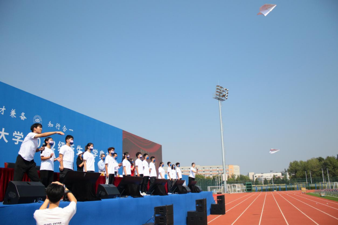 人使命与担当的薪火相传。最后,两位新生带领全部学生一起高喊“以梦为马,不负韶华,信之所向,在此启航”,并放飞代表象征着梦想与传承的纸飞机。