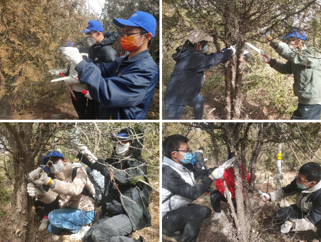 虽然伴有沙尘大风天气,但是同学们的劳动热情丝毫未减。在分组领取锯子与剪刀并认真听完现场人员的讲解后,同学们便迫不及待地开始修剪林木。