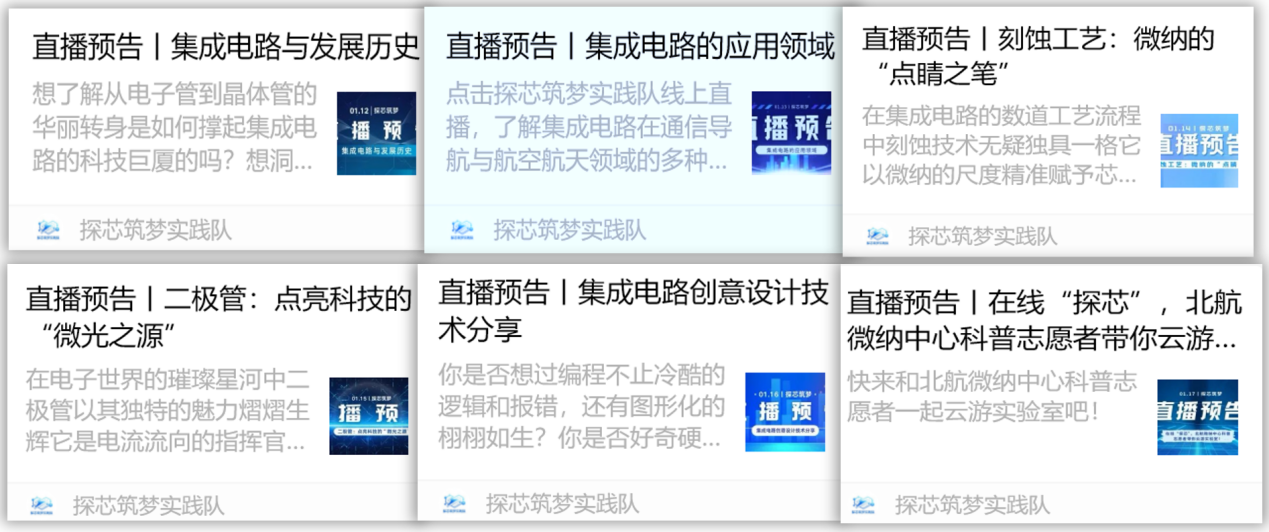 (通讯员 罗志豪)1月12日至1月17日,探芯筑梦实践队首次开展了以“探芯筑梦,云端科普”为主题的科普直播活动。本次活动得到了科创星光计划和北京航空航天大学集成电路必威、士谔书院的大力支持。