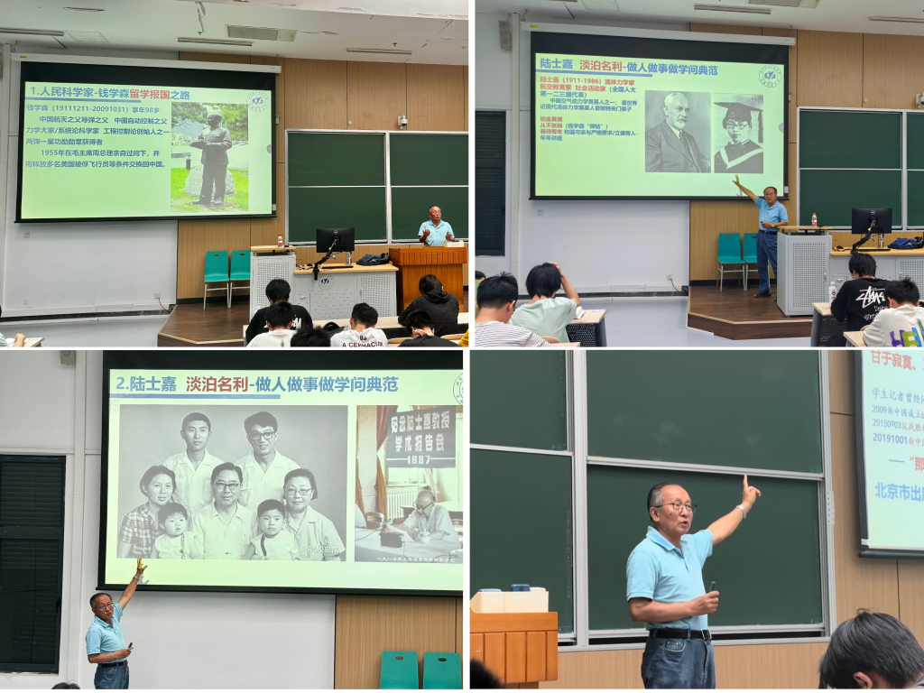 随后,郑彦良围绕“爱国、创新、求实、奉献、协同、育人”这12字科学家精神内涵,分享了六位杰出科学家的故事。海外留学的钱学森,放弃国外优厚待遇,冲破重重阻力回到祖国,为我国导弹事业的发展打下坚实基础,展现了深厚的爱国情怀;淡泊名利的陆士嘉,一心扑在科研和教育事业上,开创我国空气动力领域新局面;三十年坚守航空报国的罗阳,在重要装备研发一线默默耕耘几十载,将生命献给航空事业;归零历练的李东,不畏挫折与困难,终于实现火箭研制的重大突破;以服务国家为最高追求的苏东林,长期扎根科研一线,攻克诸多电磁兼容难题;上天出差的桂海潮,作为首位载荷专家航天员,勇敢逐梦太空,为航天事业注入新活力。在生动的讲述中,郑彦良分享了优秀科学家们的感染事迹,让同学们更加深刻理解科学家的精神的内涵。