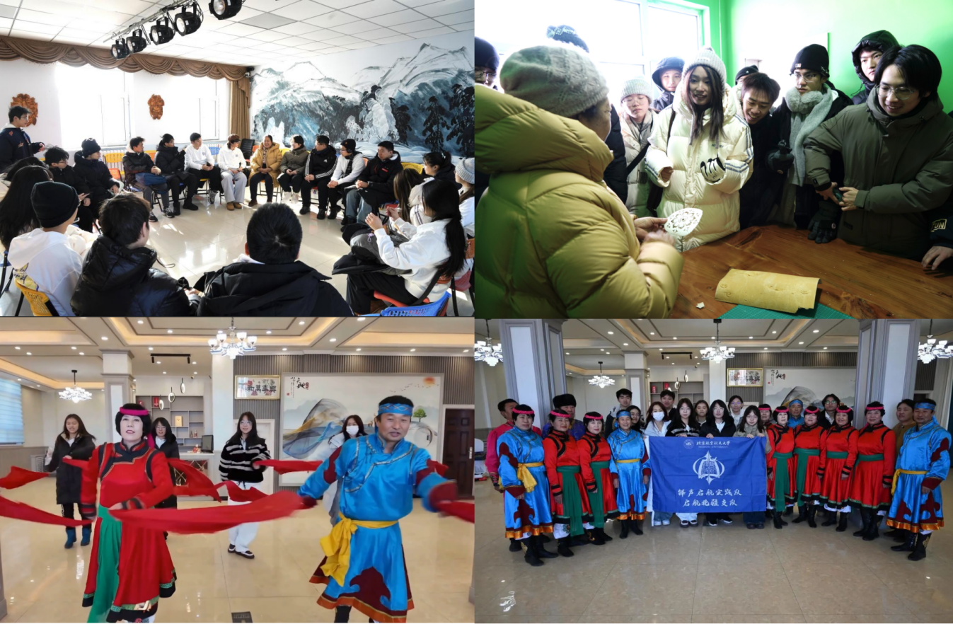 在通辽市博物馆,“通辽市古代历史陈列”与“蒙古族民俗风情陈列”系统呈现了从红山文化到蒙元时期的多民族交融史。在库伦旗白音花嘎查,国家级非遗“安代舞”以生活化的传承方式融入当地民众日常。实践队员观看并学习安代舞,了解这一古老舞蹈在当代的传承现状。从鄂伦春的桦皮技艺到蒙古族的安代舞,各民族文化在传承中相互借鉴,成为铸牢中华民族共同体意识的精神纽带。