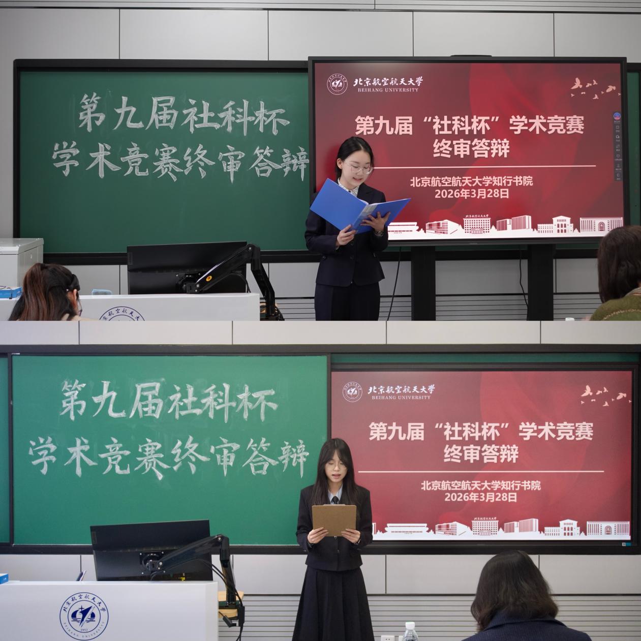 3月28日下午,知行书院第九届“社科杯”学术竞赛终审答辩在学院路校区主南204、主南206教室举行。各参赛队伍围绕人工智能、基层治理、数字法治等社会热点与现实问题开展研究。答辩现场,学生通过PPT展示、数据分析、案例展示等形式汇报研究成果。评委针对论文的研究方法、学术规范和逻辑结构进行提问与点评,肯定学生在选题立意、实地调研方面的投入,同时就样本代表性、方案可行性、数据来源等方面提出具体修改建议,帮助同学们掌握科学的研究方法,为进一步开展学术研究打下坚实基础。