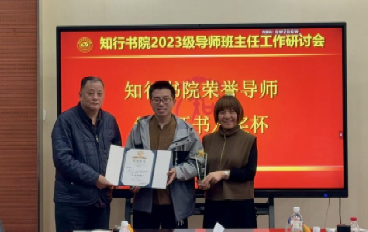 随后,举行了知行书院荣誉导师颁奖仪式,根据知行书院制度,在书院工作满五年的导师,会获得知行书院荣誉导师(一星)称号,每满五年加一星,本年度获得知行书院荣誉导师(一星)称号的是来自人文公管必威的李跟强老师,郑晓齐院长和沈映春老师分别为李跟强老师颁发了证书及奖杯。李跟强老师分享了自己在导师工作中的经验和感受,他强调导学工作应紧密结合学生需求,助力学生实现从高中到大学思维模式的转变,促进其全面发展。