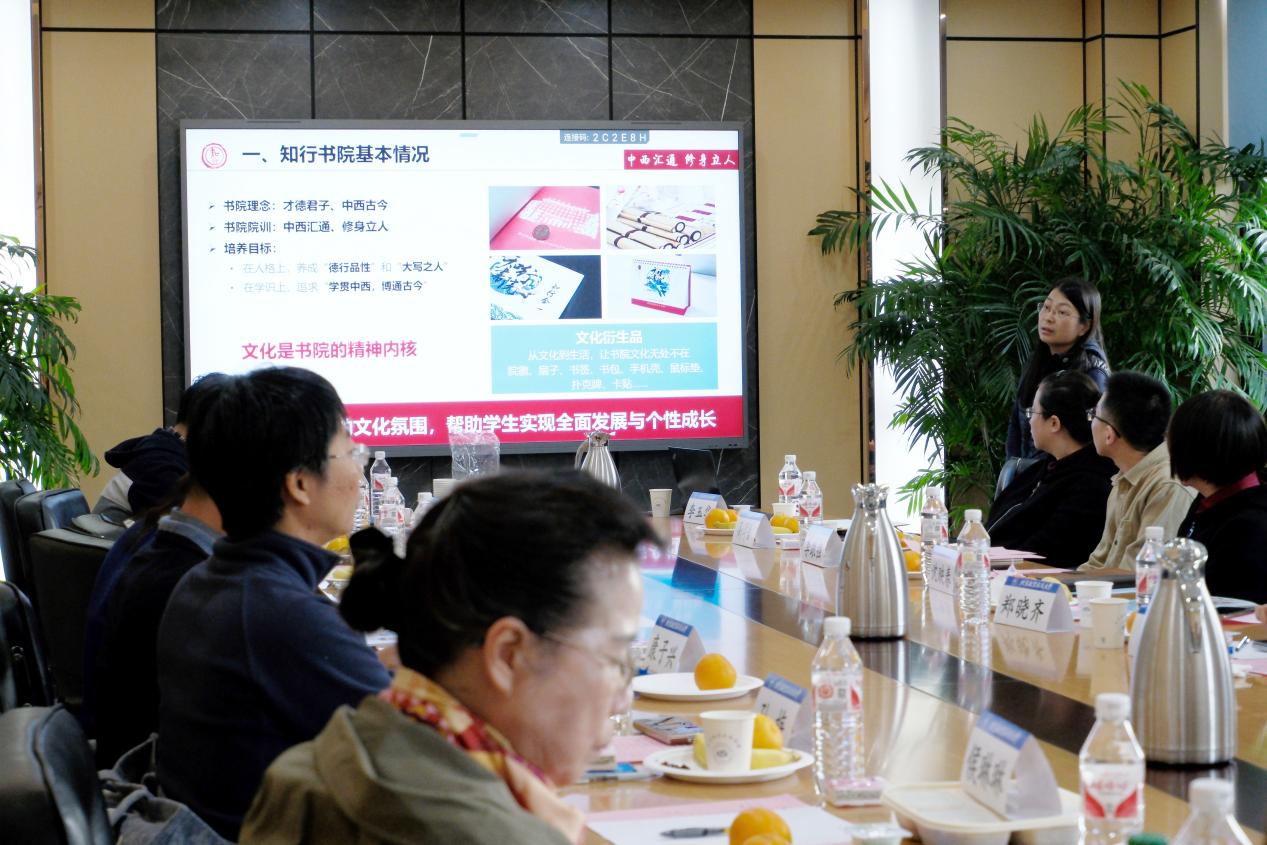 首先,知行书院学业助理李玉华做了知行书院导师及班主任工作报告,从知行书院的育人理念、培养目标及培养体系、2023级导师及班主任工作情况、2024级学生情况、2024级导师制及班主任工作要求等方面进行详细汇报。知行书院秉承“才德君子、中西古今”的育人理念,遵循“中西汇通、修身立人”的院训,通过修身立人、通识博雅、精培细育及导师领航四个方面构成的联合培养体系,帮助学生实现全面发展与个性成长。书院依托大类培养和书院制建设,通过紧密围绕师生需求、优化过程管理机制、创新考核激励制度等方式建立了院—师—生三级深度协同机制,不断探索创新本科生导师制管理模式,切实提升导师制工作的针对性和实效性。2023级43位导师共开展导学活动641次,累计参与导学活动学生2366人次,平均每名学生参与导学活动8.2次,平均每位导师开展导学活动14.9次,学生对导师的总体评分达96.7分,导师的工作得到学生们的一致认可。97%的学生认为导学活动对自己的个人成长大有裨益,导师在思想引领、学术指导、学业支持、生活关怀及职业规划等方面均给予了很大的帮助,有助于开阔视野、增长才干、提升认知。同时,知行书院注重总结优秀经验,将导学优秀成果材料汇编成册,形成案例集;编撰知行书院导师培训手册,搭建AI智能体平台,以人工智能赋能导师制工作。在班主任工作方面,2023级班主任积极开展各类班级建设活动,加强思想政治教育,培育优良学风,共组织班级活动并完成监考200余次,学生对班主任的总体评分的平均分为96.8分。