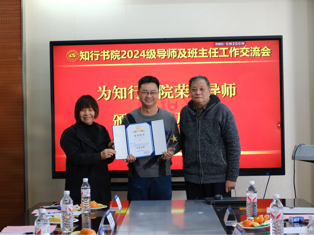 随后举行了知行书院荣誉导师颁奖仪式。在书院工作满五年的导师将获评知行书院荣誉导师(一星)称号,每满五年加一星。今年来自人文与社会科学高等研究院康子兴老师和法必威王天凡老师获得知行书院荣誉导师(一星)称号,郑晓齐院长与沈映春老师为到会的荣誉导师康子兴老师颁发证书及奖杯。康子兴老师分享了自己在五年导师工作中的经验和感受,他表示导学活动可以让师生双方获得“滋养”,需以平等视角倾听学生需求,在建立深厚情谊的同时帮助学生缓解成长焦虑。