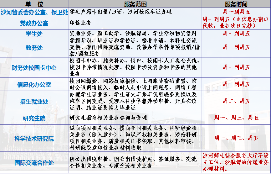 沙河校区师生综合服务大厅已建成,现将《关于沙河校区师生综合服务大厅启用的通知》转发给大家。