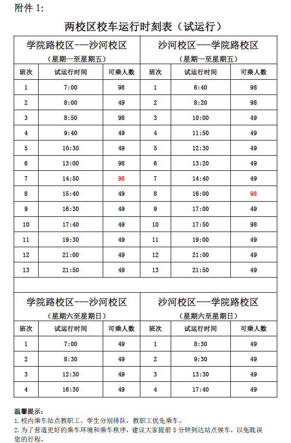 附件1:《两校区校车、沙河校区摆渡车运行时刻表(试运行)》