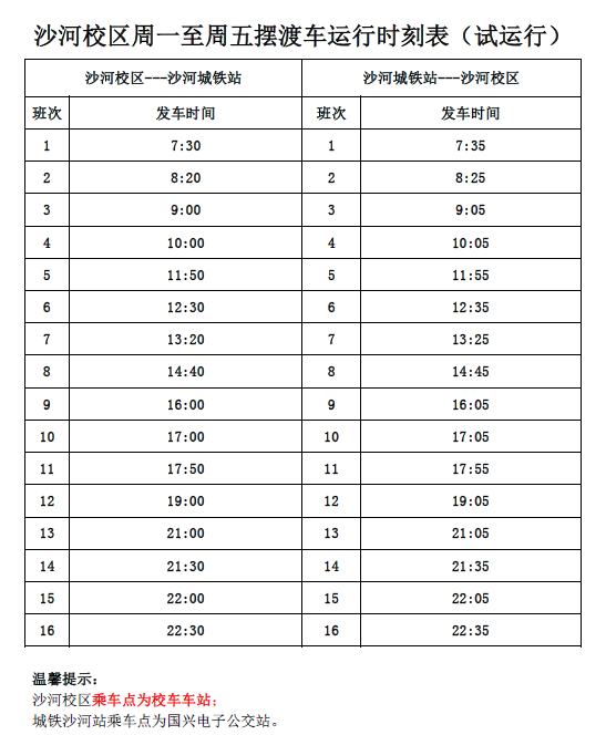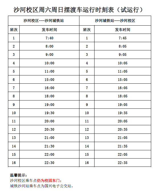 2.调整摆渡车的运行班次:周一至周五增设至每日运行16趟摆渡车,发车地点由摆渡车乘车点调整至校车车站,主要发车时间与校车发车时间一致;周六日调整运行班次,发车地点仍在校区东门摆渡车乘车点。